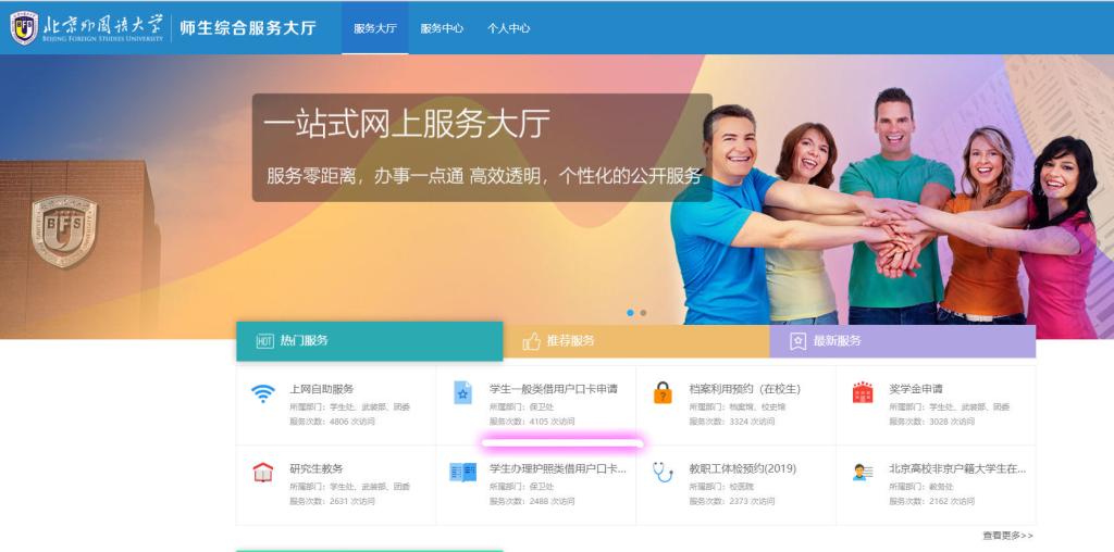 1.学生申请流程:先通过“数字北外”上的“一站式网上服务大厅”,提交不需要户口卡原件的“学生一般类借用户口卡申请”,学院辅导员审批通过之后,把本人的一卡通(或学生证)和身份证拍照后,发到指定电子邮箱。